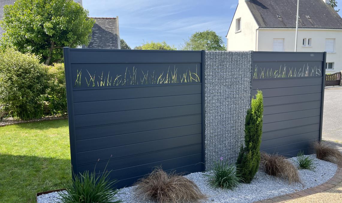 couleur : gris Cayenne - Deux clôtures de 4,60 m et 11m en lame écran composite Atmosphère couleur gris anthracite, où sont insérés des décors "végétal" en aluminium.