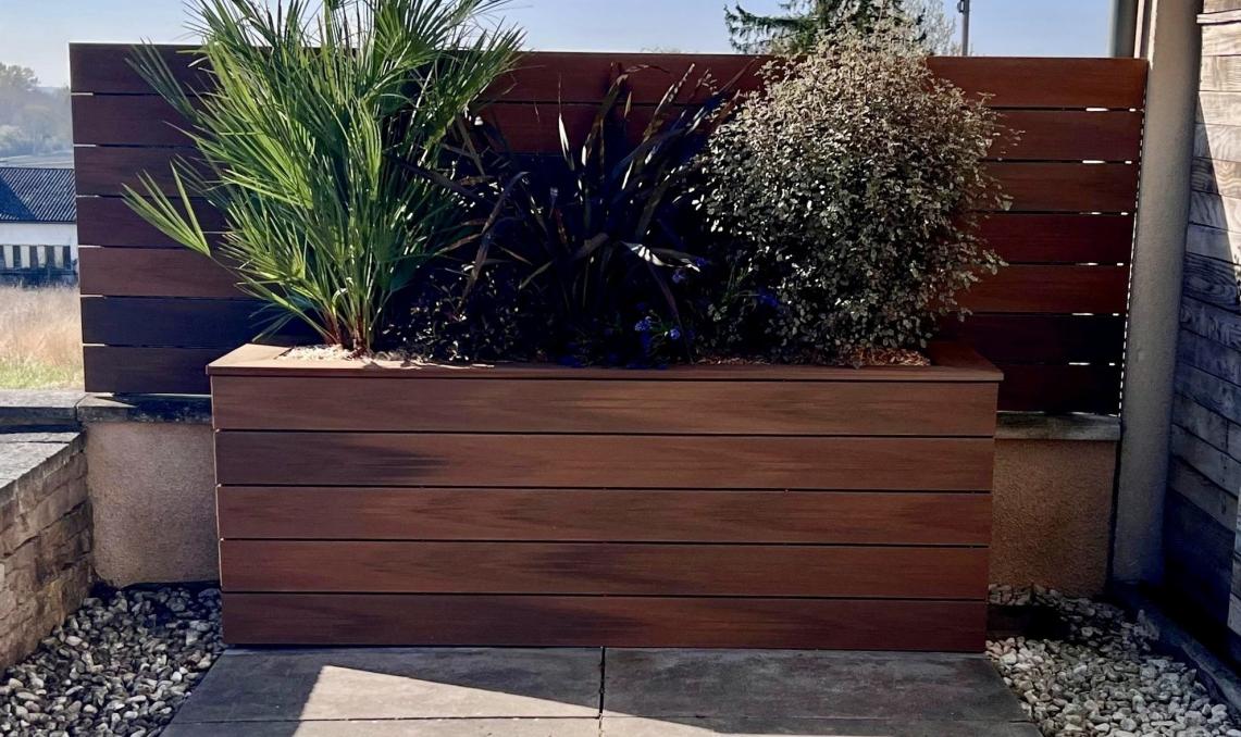 Pour conserver les dalles existantes, une jardinière sur-mesure a été créée et habillée avec les lames et planches de finition Atmosphère Nuances Ipé. Les finitions soignées, avec des coupes à 45 degrés, ajoutent une touche de raffinement supplémentaire.