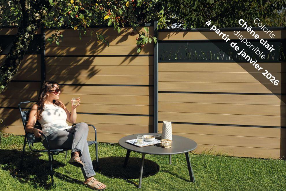 Laat u verleiden door de harmonie en de esthetische kwaliteiten van deze afsluiting, die bestaat uit gecoëxtrudeerde planken omkaderd door aluminium accessoires en palen.