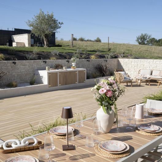 Les lames Élégance et Émotion présentent une structure monoextrudée authentique. Sans enveloppe protectrice, l'aspect bois naturel reste visible et évolue au fil des saisons, nécessitant un entretien périodique adapté. La teinte se patine naturellement avec le temps. L'installation échelonnée, le positionnement de mobilier ou d'éléments décoratifs peut générer des nuances chromatiques entre les différentes zones.